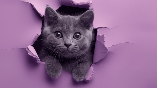 WonderMuralMischievous Cracks This captivating mural wallpaper features an adorable gray kitten emerging through a textured violet background, creating an ill...