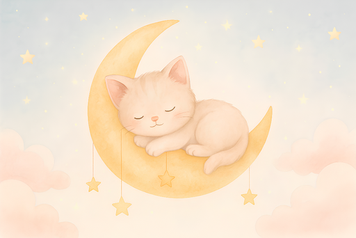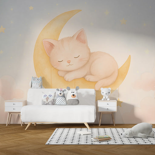 WonderMuralThis enchanting mural wallpaper features an adorable white kitten sleeping on a golden moon, surrounded by soft clouds and sparkling stars. The pas...