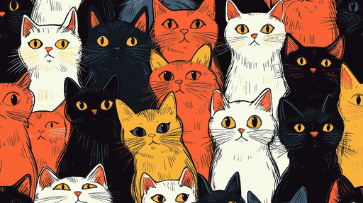 WonderMuralOur mural wallpaper features a captivating pattern of illustrated cats in a vibrant color palette, including black, white, orange, and gold hues. E...