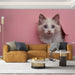 The Curious Cat Mural Wallpaper offers an adorable depiction of a young white kitten with blue eyes, emerging from an irregular cutout in a solid pink background. This image captures the innocence and curiosity of the kitten, with its big blue eyes and fine whiskers adding an irresistible touch of sweetness.