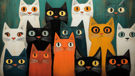 WonderMuralDiscover our charming mural wallpaper featuring four colorful cats with sparkling eyes, each in vibrant shades of black, red, and blue. They stand ...