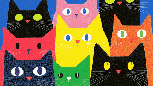 WonderMuralThis mural wallpaper features a playful composition of stylized cats in bright colors. Each cat, with its unique expression and vibrant shades, cre...