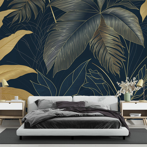 View full detailsBlack and Gold Mural Wallpaper | Golden Leaves and Stems on Midnight Blue Background