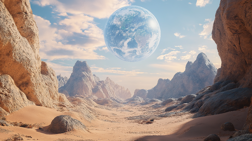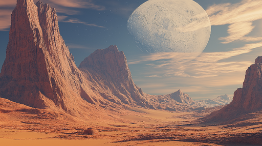 WonderMuralThis captivating mural wallpaper features a majestic desert landscape, dominated by impressive rock formations. Above, a vast translucent planet se...