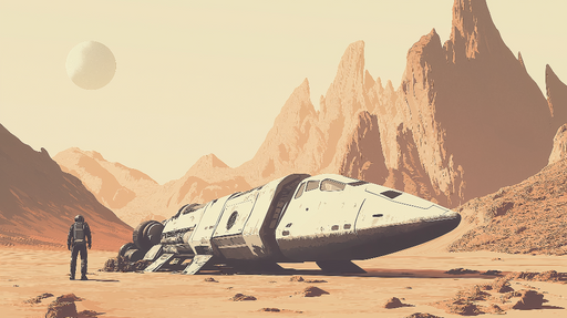WonderMuralThis captivating mural wallpaper features an extraterrestrial landscape with a spaceship stranded on a desert surface, surrounded by majestic mount...