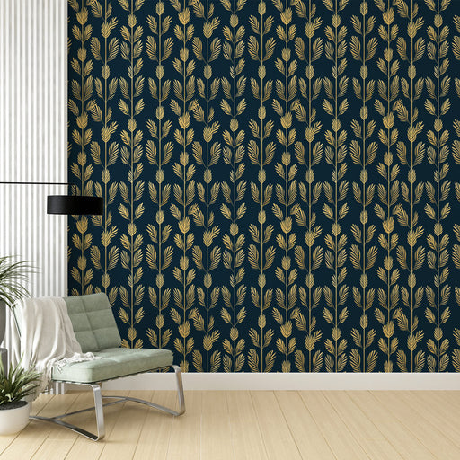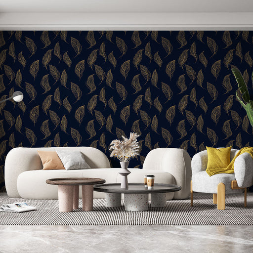 This mural wallpaper features an elegant illustration of golden feathers on a deep midnight blue background. The feathers, with their fine details ...
