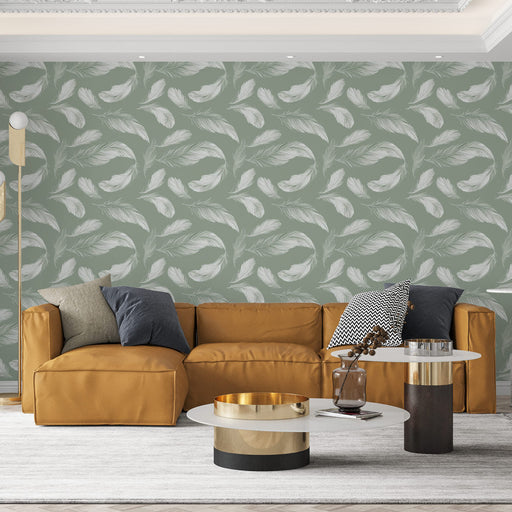 Mural Wallpaper feathers | Feather pattern on green background