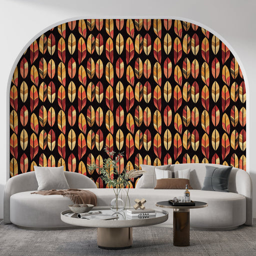 WonderMuralOur mural wallpaper features a beautiful pattern of stylized feathers in warm shades of red, gold, and orange, standing out against an elegant blac...