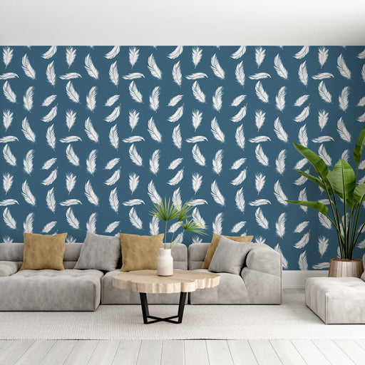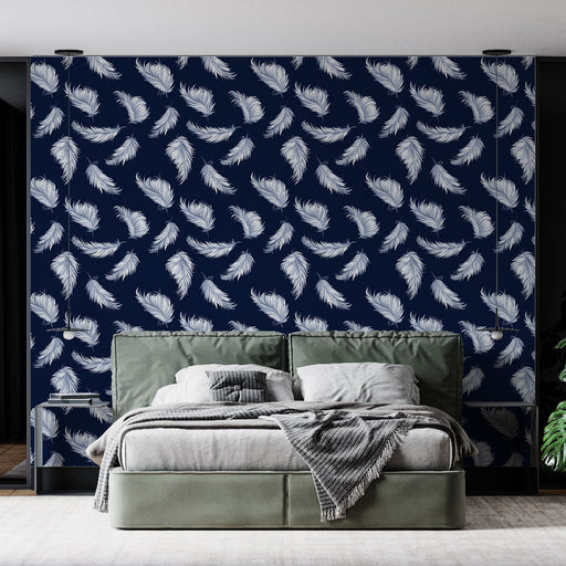 This captivating Mural Wallpaper features an elegant pattern of white feathers delicately floating on a deep navy blue background. The random arran...