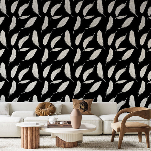 Mural Wallpaper feathers | White feather pattern on black background