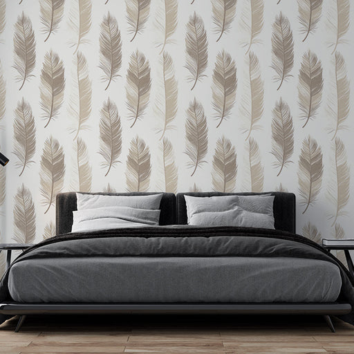 WonderMuralOur Mural Wallpaper highlights a delicate motif of white feathers, subtly distributed on a soft beige background. The meticulous textures of the fe...