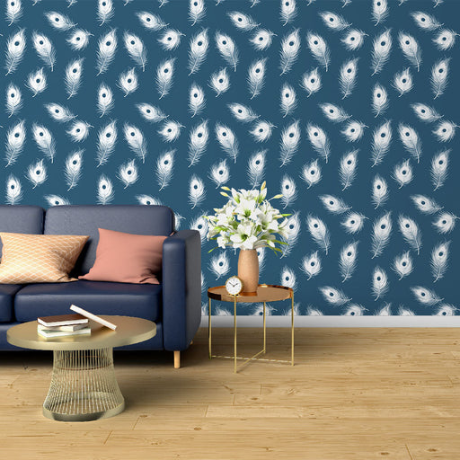 WonderMuralOur wallpaper features a charming pattern of white feathers on a deep blue background, bringing an elegant and light touch to your space. The feath...