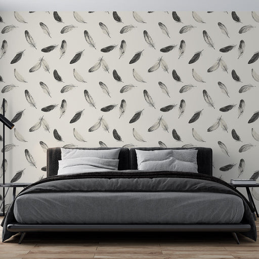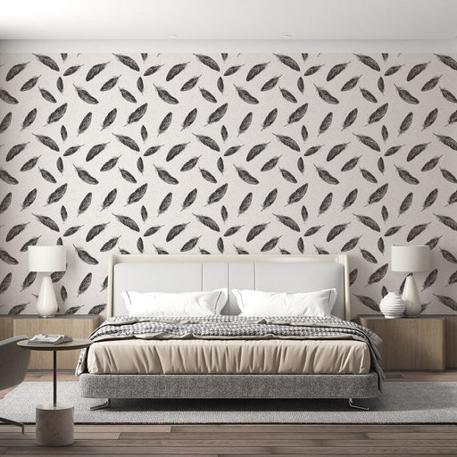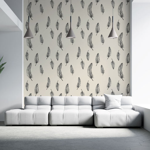 Our Mural Wallpaper highlights a delicate motif of white feathers, subtly distributed on a soft beige background. The meticulous textures of the fe...