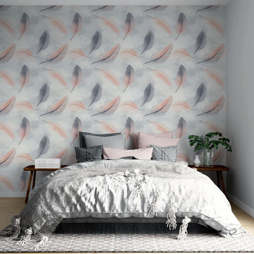 Our unique Mural Wallpaper features a multitude of delicately stylized feathers, oscillating between shades of soft pink, gray, and black, creating...