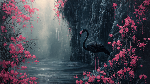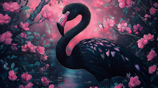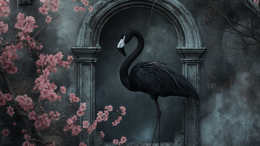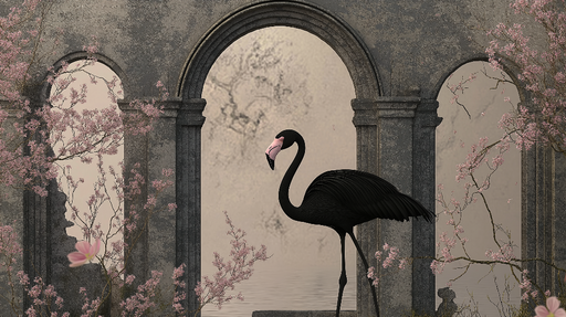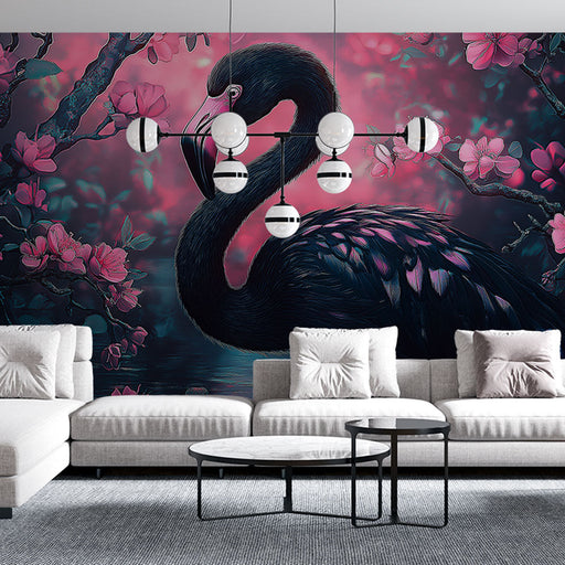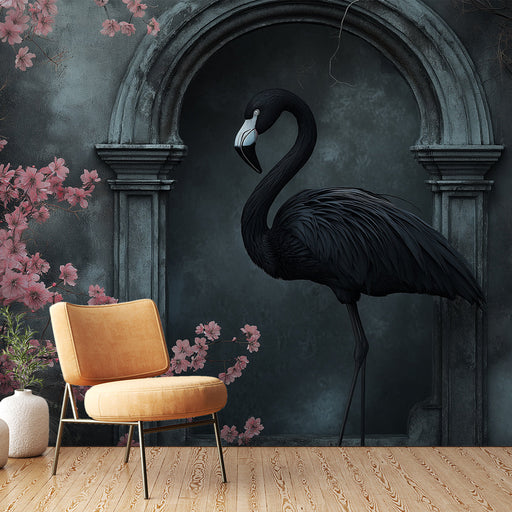 WonderMuralOur exclusive Mural Wallpaper features a majestic black flamingo, gracefully standing in an elegant vintage frame, enhanced by pink cherry blossoms...