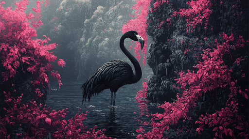 WonderMuralImmerse yourself in an enchanting world with our wallpaper representing a majestic black flamingo, gracefully standing at the edge of a calm body o...