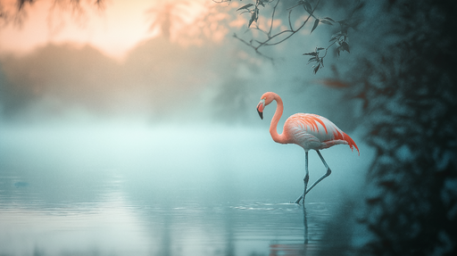 View full detailsMural Wallpaper flamingo | Elegant flamingo in a serene and misty landscape