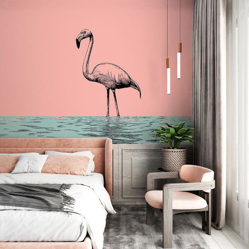 WonderMuralThis unique mural wallpaper features a stylized pink flamingo standing on calm waters, surrounded by a soft pastel background. The illustration, bo...