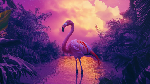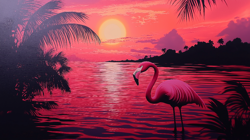 Solar ArtDive into a dreamy world with this wallpaper depicting a beautiful pink flamingo standing majestically in front of a vibrant sunset. The pastel sha...