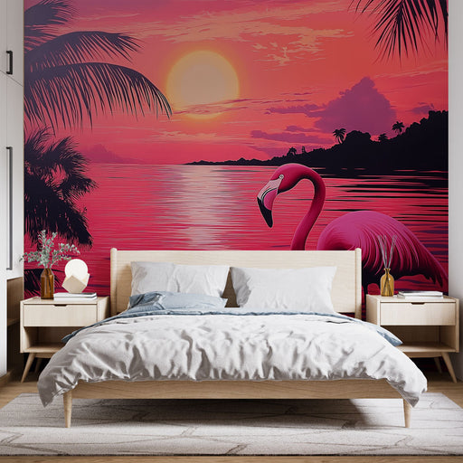 WonderMuralOur wallpaper evokes a magical moment with its tropical landscape at sunset, where a pink flamingo stands majestically in the calm waters. The vibr...