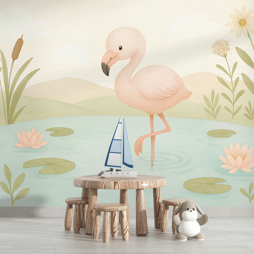 WonderMuralOur wallpaper features a beautiful pink flamingo standing on a peaceful water surface, surrounded by lotus flowers and greenery. The soft, pastel s...
