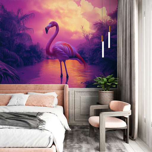 WonderMuralThis beautiful wallpaper highlights a majestic pink flamingo standing in the calm water of a tropical jungle. The purple and pink shades create an ...