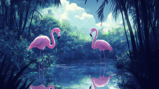 WonderMuralThis beautiful wallpaper showcases a vibrant tropical scene, where pink flamingos stand gracefully at the edge of a tranquil lake. The rich backgro...