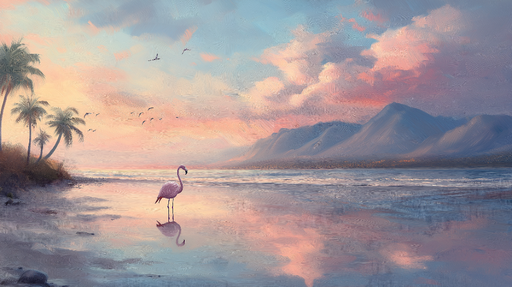 Solar ArtThis wallpaper features a beautiful pink flamingo gracefully standing at the edge of a lake, surrounded by mountains in soft pastel shades of pink ...