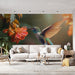 Our mural wallpaper features a magnificent pattern of a hummingbird in action, heading towards a glowing flower. The vibrant and detailed colors of the hummingbird, combining shades of green and blue, create a lively and dynamic atmosphere. The flower with delicate petals adds a touch of warmth, accentuating the natural beauty of this scene.