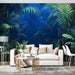 Discover our mural wallpaper inspired by the tropical jungle, where a palette of lush greens blends with deep shades of blue, creating a soothing and enchanting atmosphere. The leaves of different sizes and shapes, illuminated by a soft light, bring a touch of exoticism to your space.
