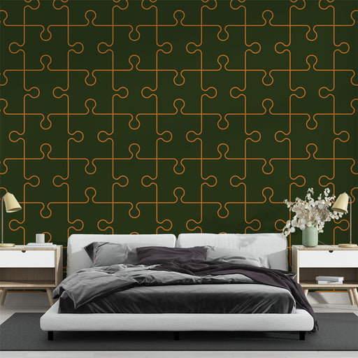 Studio SamaThis geometric puzzle mural wallpaper features golden lines on a dark green background, creating an elegant and sophisticated pattern. Perfect for ...