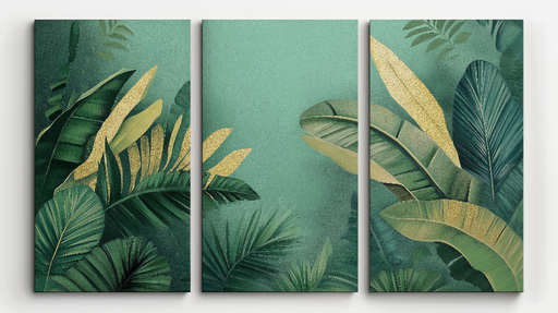 WonderMuralThis captivating mural wallpaper features a dazzling pattern of tropical leaves in vibrant shades of green, enhanced with golden touches. The deep ...