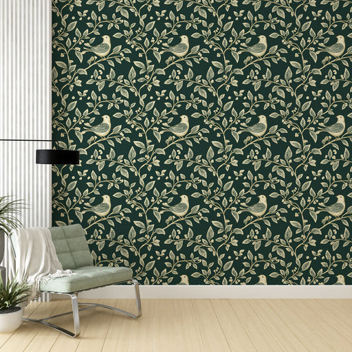 WonderMuralThis beautiful wallpaper features a floral design adorned with golden birds nesting among lush leaves. The dark green background creates a striking...