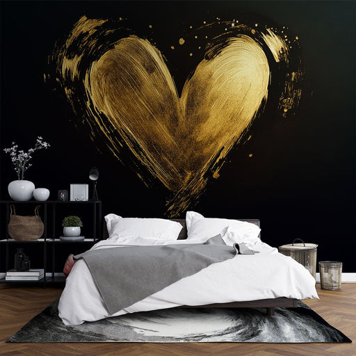 WonderMuralGolden Heart Mural Wallpaper on Black Background This mural wallpaper features a shiny golden heart hand-painted on a deep black background, creati...