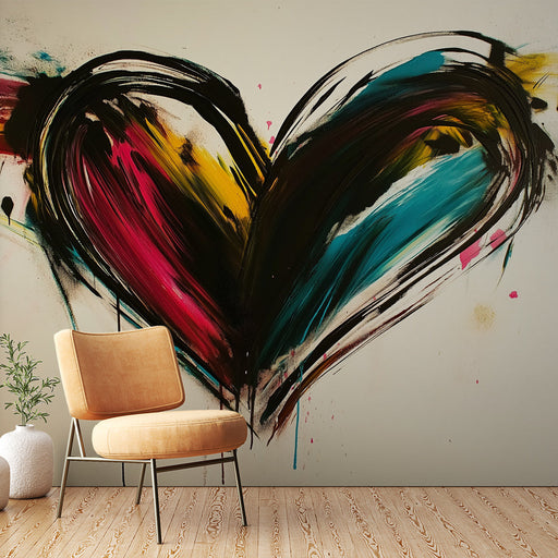 WonderMuralThis mural wallpaper features an abstract heart in dynamic brushstrokes, with splashes of vibrant colors. Shades of red, turquoise, black, and a to...