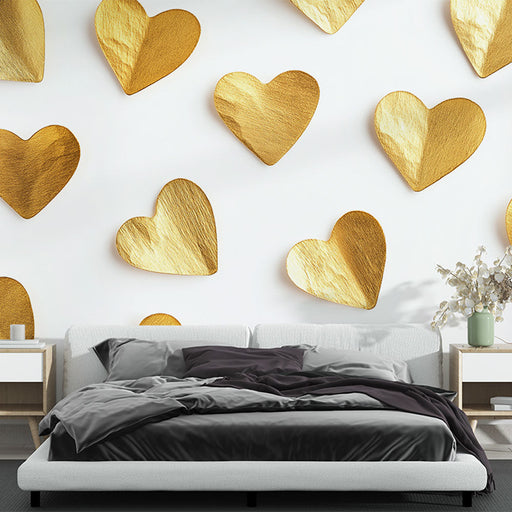 WonderMuralThis elegant mural wallpaper highlights a multitude of golden hearts delicately spread across a pure white background, creating a chic and refined ...