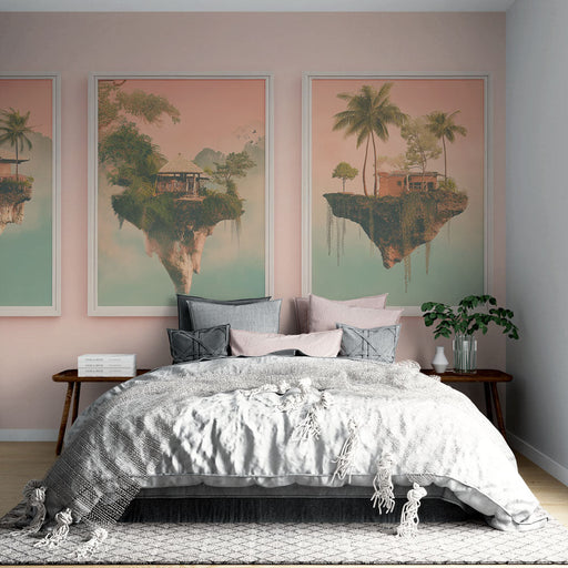 WonderMuralOur original Mural Wallpaper features a floating landscape where lush islands are surrounded by soothing pink clouds. Each panel offers a unique sc...