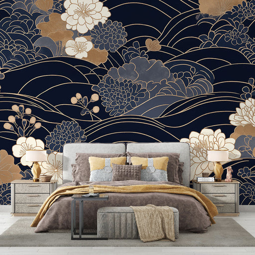WonderMuralThis elegant Mural Wallpaper features a refined Japanese floral pattern with light flowers on a navy background, creating a peaceful and sophistica...