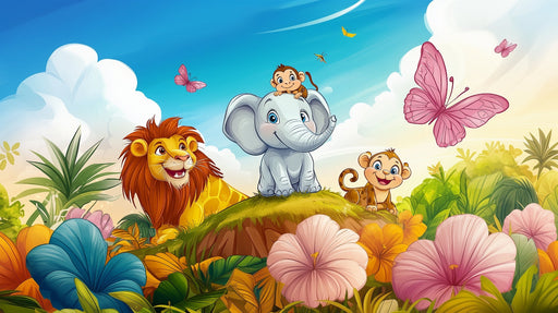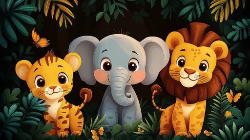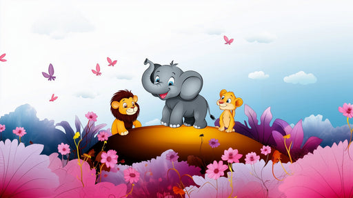 WonderMuralThis mural wallpaper features a tropical animated universe with a smiling lion, a curious elephant, and a young lion cub, all surrounded by lush fo...