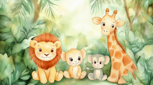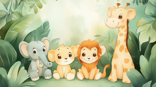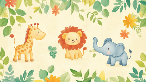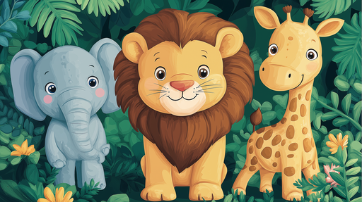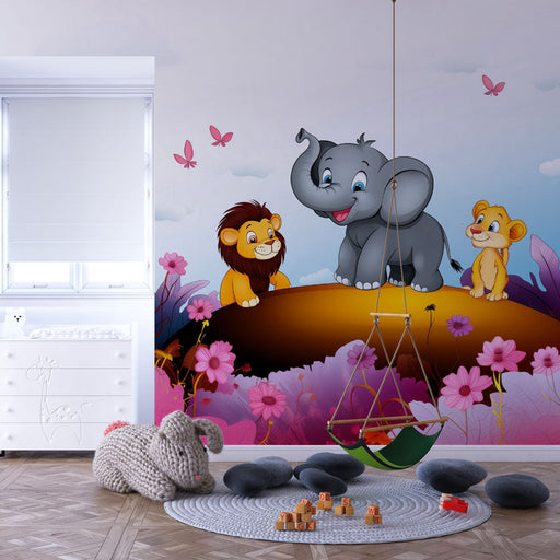 WonderMuralThis playful and colorful mural wallpaper features a cute lion, a gentle elephant, and a joyful giraffe, all surrounded by lush vegetation. The vib...