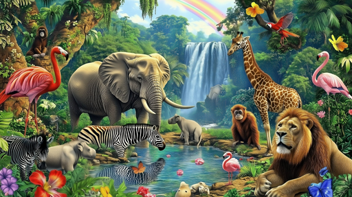 WonderMuralThis unique mural wallpaper showcases a fascinating array of jungle animals, including a leopard, a sloth, a snake, and a frog, surrounded by vibra...