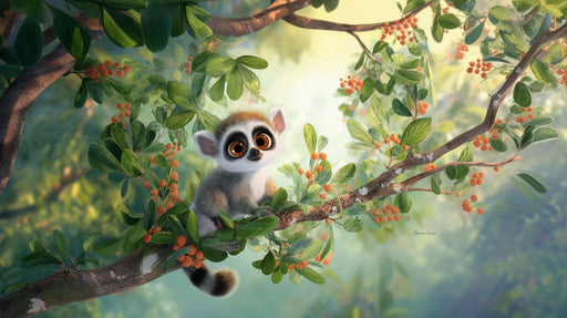 Art'loloThis Mural Wallpaper little lemur captures the beauty and innocence of an adorable lemur perched on a branch surrounded by lush foliage and red ber...