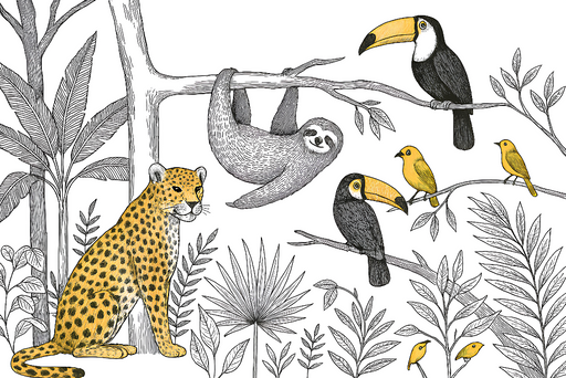 View full detailsMural Wallpaper jungle animals | A leopard, a sloth, and colorful birds