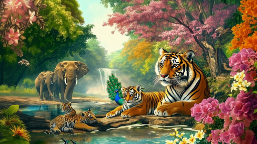 The jungle animals mural wallpaper collection brings the exuberance and vitality of the tropical jungle directly into our interiors. This collection is inspired by the richness of tropical forest fauna and flora, featuring vibrant patterns of wild animals and lush vegetation. From the majestic tiger to the elegant flamingo, each design is a tribute to the diversity and beauty of jungle life. Like our oceanic marine animals mural wallpaper, these mural wallpapers are perfect for those looking to create a bold, colorful, and lively space.