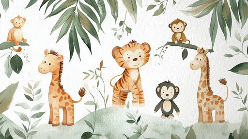 Art'loloDiscover our jungle mural wallpaper for kids with adorable watercolor-painted animals. This design features giraffes, tigers, and monkeys amidst lu...