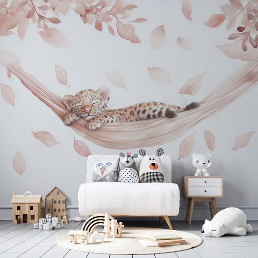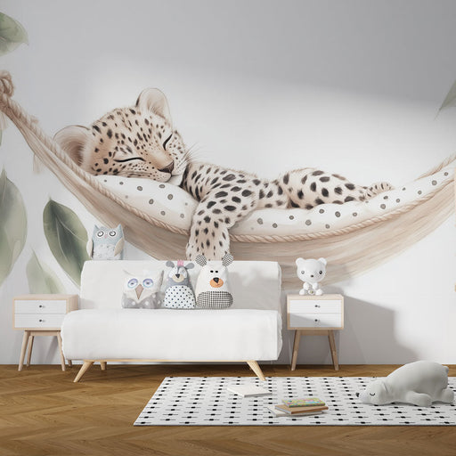 Art'loloTransform your child's room into a dream space with our kids' mural wallpaper featuring an adorable sleeping baby leopard on a hammock. The light l...