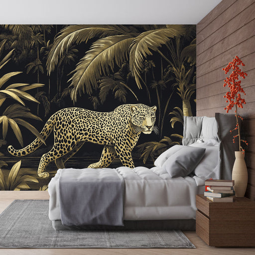 WonderMuralOur beautiful mural wallpaper features a pattern of golden leopards on a black background, surrounded by a lushness of tropical leaves. The mysteri...