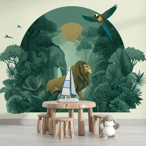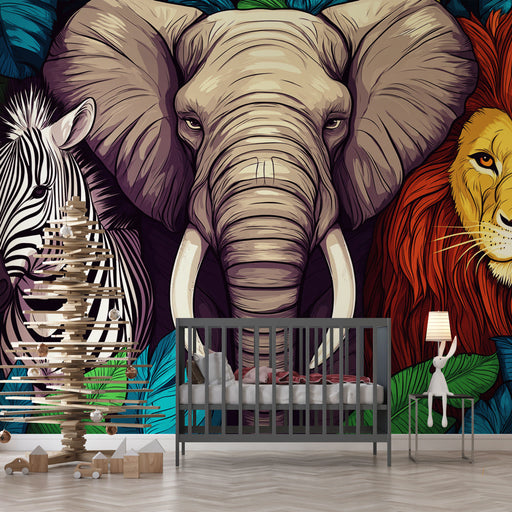 WonderMuralThis vibrant mural wallpaper features a majestic elephant, a proud lion, and an elegant zebra amidst lush tropical foliage. The rich colors and fin...