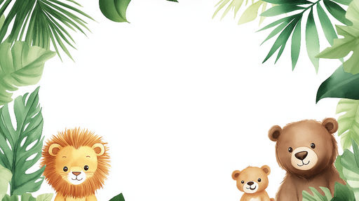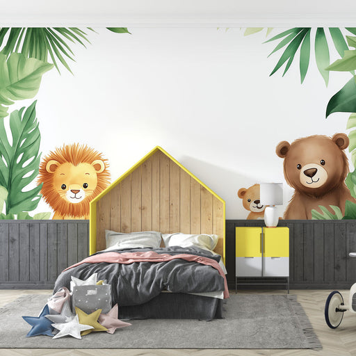 WonderMuralThis enchanting mural wallpaper features adorable illustrations of a lion cub and a bear, surrounded by lush tropical foliage. The soft and warm co...