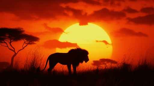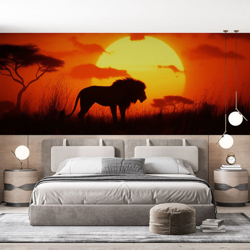 WonderMuralThis captivating mural wallpaper features a majestic lion silhouette against a blazing sunset. The warm shades of orange and red create a dynamic a...